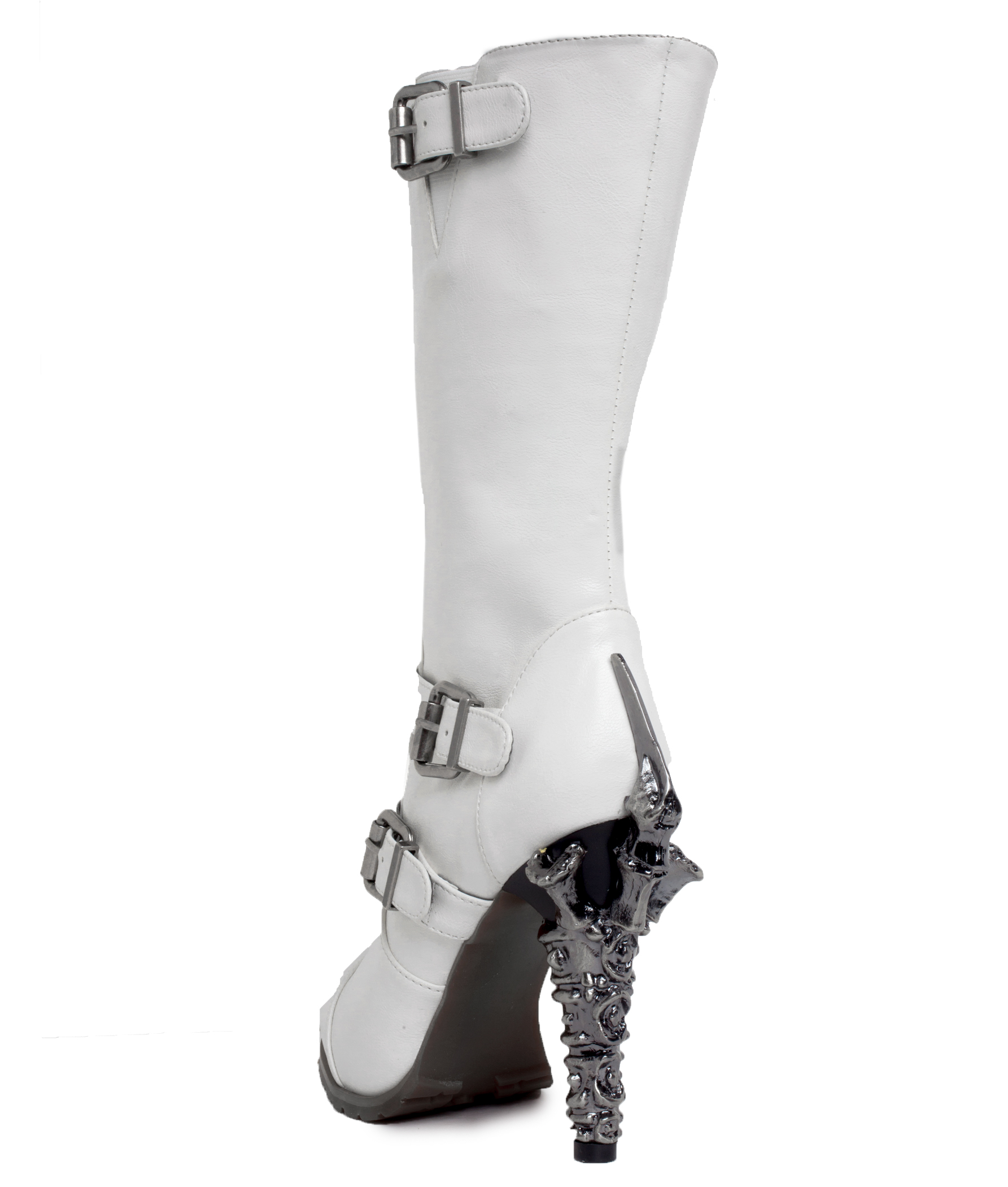Heavy metal biker inspired boots w/ 5″ Claw heel, adjustable ankle and top straps w/ inner zipper, animal friendly synthetic leather w/ double insole padding and thick outsole.